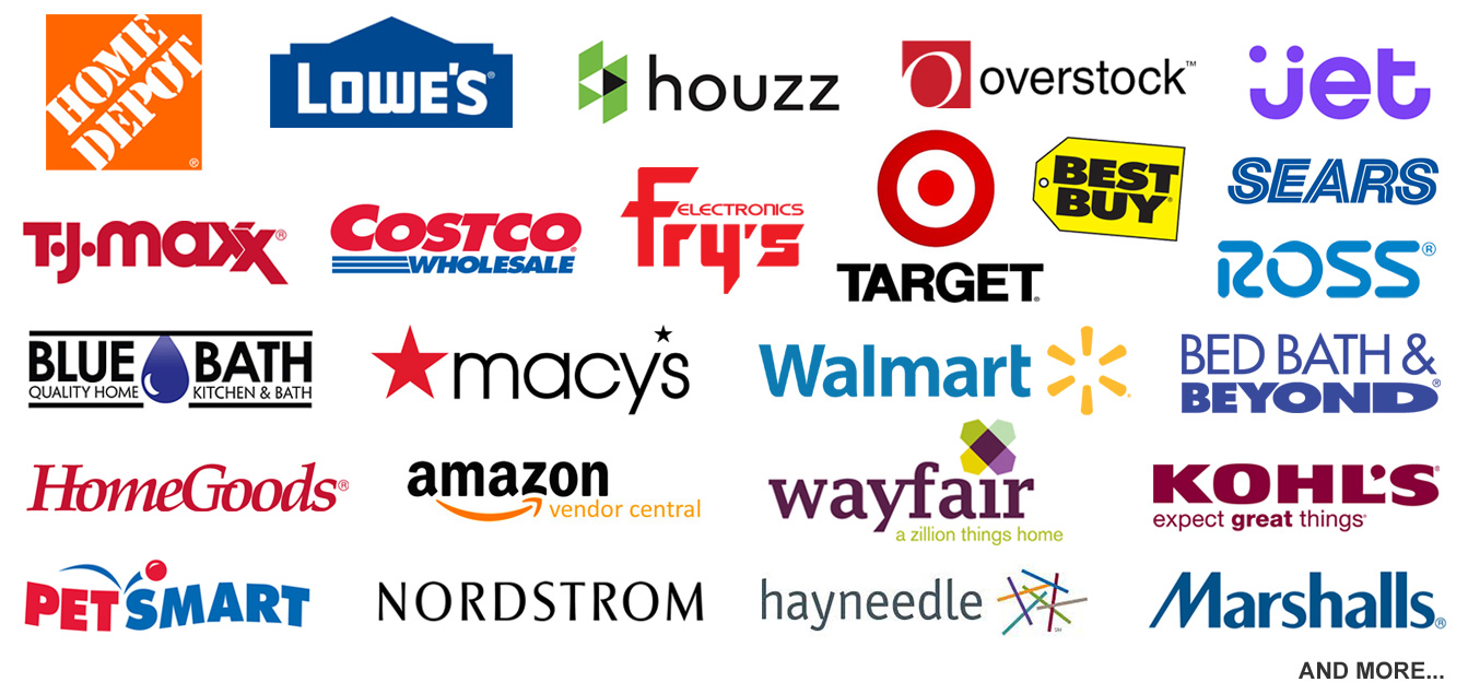 Chúng tôi hợp tác với các nhà bán lẻ nhượng quyền thương mại điện tử hàng đầu và trên toàn quốc như HomeDepot.com, Wayfair.com, Houzz.com, Lowes.com, Overstock.com, Amazon Vendor, Costco, TJ Maxx và nhiều hơn nữa.